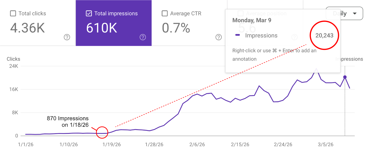 SEO is a long-term game, usually taking 6 to 12 months to really compound. Having said that, we've seen content start ranking in a couple of weeks or within a month. What's important is once it kicks in, it's free, constant traffic that actually converts. Completely worth it.